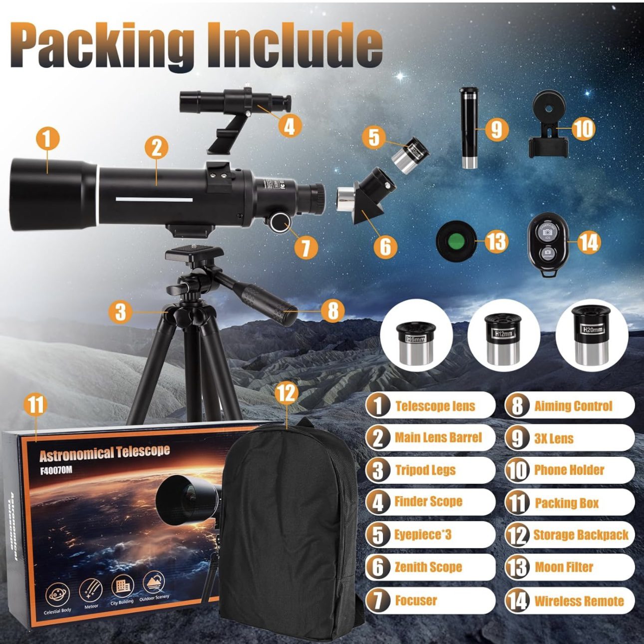 Telescopio, F40070M para adultos astronomía, 2.756 in de apertura 15.748 in telescopio refractor (20-200x) para principiantes de astronomía, trípode y adaptador de teléfono, mochila de telescopios