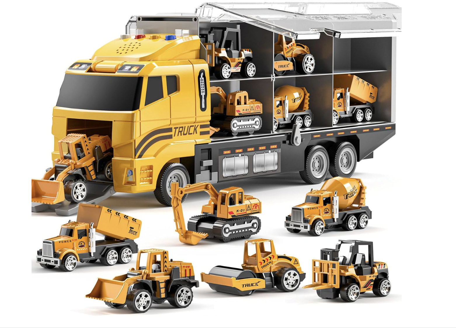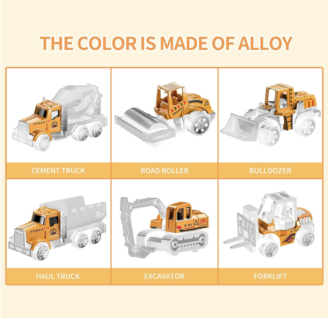 • Juego de vehículos de construcción de juguete para niños: equipado con 1 alfombra de juego plegable, 1 auto de transporte multifunción, 1 alfombra de juego plegable, 1 camión de carga largo, 1 carretilla elevadora, 1 bulldozer, 1 rodillo de carretera, 1 excavadora, 1 camión de cemento, 1 camión de volquete y un conjunto de señales de carretera. Es muy recomendable para niños mayores de 3 años para crear infinitos momentos felices.