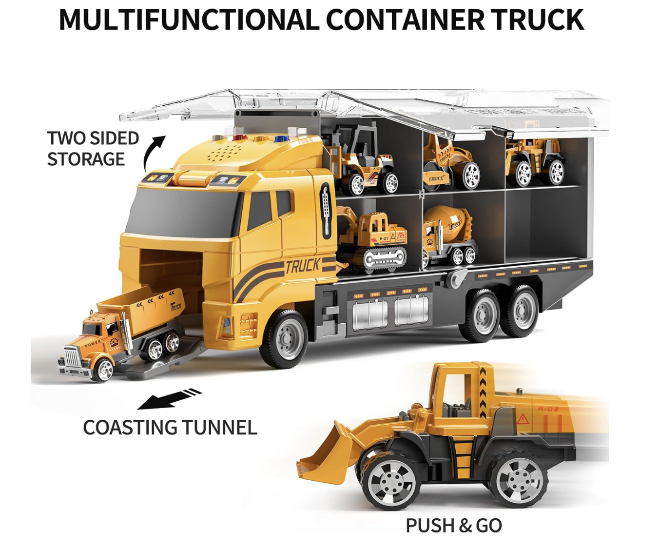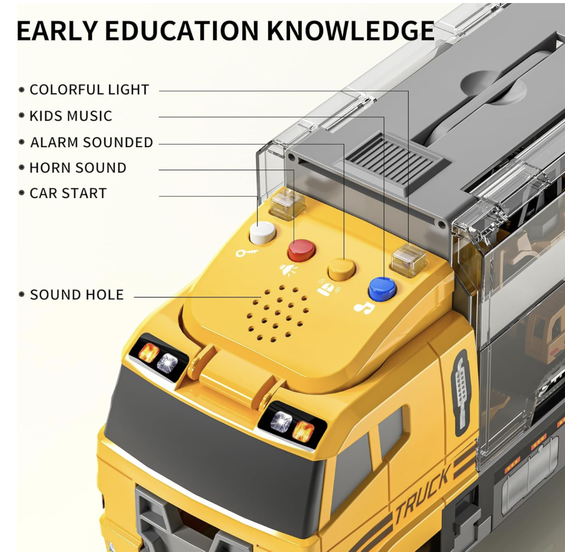 • Vehículos de juguete multiusos: incluye 12 espacios de estacionamiento en ambos lados de este vehículo de transporte, conveniente para que los niños almacenen vehículos fundidos a presión. Hay un mango oculto en la parte superior del camión, los niños pueden cambiar el lugar en cualquier momento para continuar el juego. Muy adecuado para juegos de interior y juguetes al aire libre.