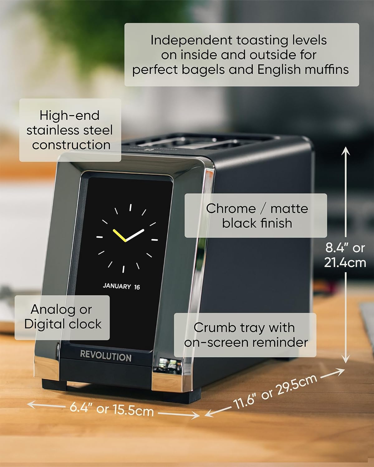 Tostadora de pantalla táctil Revolution InstaGLO R180B – negro mate/cromo para 2 rebanadas, ajustes inteligentes de alta velocidad para un tostado perfecto, compatible con accesorio Panini Press